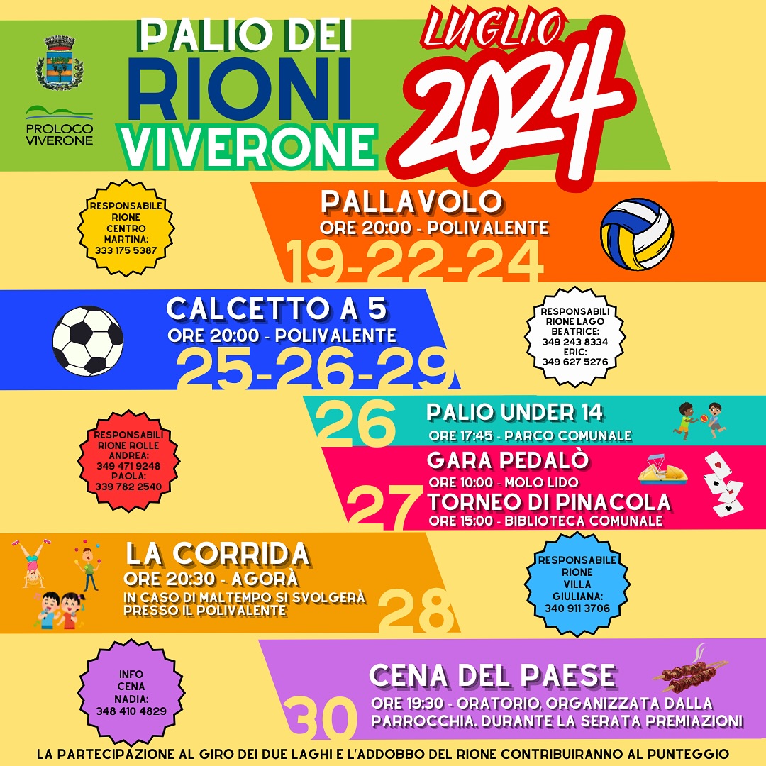 Cos'è? dal 19 al 30 luglio ritorna il Palio! I rioni Rolle, Villa, Centro e Lago si sfideranno tra sport e divertimento per decretare il vincitore del Palio 2024!